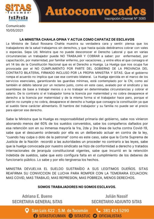 Tucumán.- Mediante un comunicado, SiTAS (Sindicato de Trabajadores Autoconvocados de la Salud de Tucumán) responde a la Ministra de Salud Rossana Chahla y al Gobierno de la Provincia tras los ilegítimos descuentos que sufrieron los sueldos de nuestros compañeros: “Somos trabajadores, no somos esclavos”.